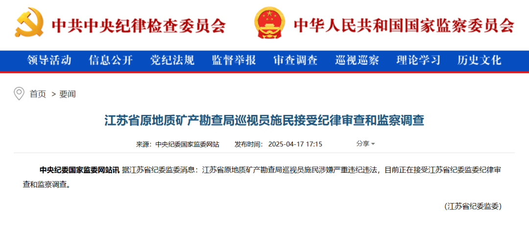 近日,能矿领域两人被查。中央纪委国家监委网站发布消息,据江苏省纪委监委消息:江苏省原地质矿产勘查局巡视员施民涉嫌严重违纪违法,目前正在接受江苏省纪委监委纪律审查和监察调查。