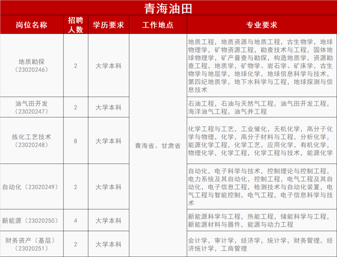 4月24日,中国石油发布2023年高校毕业生春季招聘信息公告,多家油田单位随之响应,于同日发布了招聘启事,其中包括长庆油田、新疆油田、青海油田、吐哈油田、玉门油田。