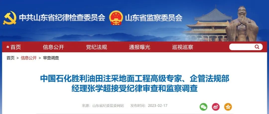 2月17日,山东省纪委监委网站发布消息,中石化三人被查,具体情况如下: