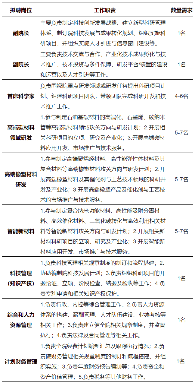 专业技术人员若干名。主要从事高端碳材料、高端橡塑材料、智能新材料等领域研究开发与应用推广的相关技术人员。 -