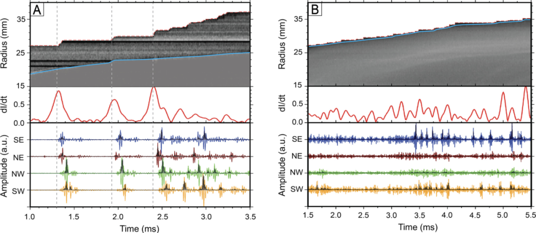 Cochard说:“这是一个非常动态的过程。新裂缝在断裂停滞前沿线的某个地方形成,局部扭曲,导致裂缝以声速在断裂线方向上扩展,然后液体跟进。裂缝停止,夜体渗透,引起断裂前沿应变,新的裂缝再次开始遵循相同的动力学过程。”各种流体粘度下水力压裂实验的原始图像,每秒捕获100000帧。内环和外环分别对应于液体及断裂前沿的位置。通过视频,可以看到裂缝前沿呈现出停止和前进的抖动运动。振幅和时间随流体粘度而变化。研究发现,这些跳跃之间的振幅和时间取决于液体的粘度。对于低粘度液体(如水),跳跃之间的时间很短,因为流体几乎瞬间就渗透到裂缝中。对于高粘度液体(如甘油,其粘度类似于蜂蜜),所谓的断裂前沿(裂缝所在的位置)和流体前沿(液体尖端所在的位置)之间的滞后时间会增加,因为高粘度流体需要更长的时间才能渗透到裂缝中并将其扩展。