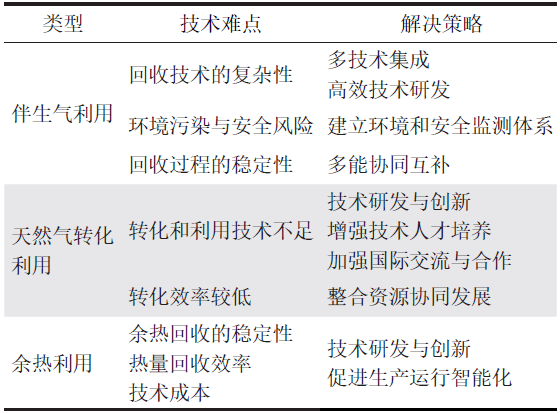 “碳减排”主要指在油气开采、净化、利用等各个环节有机融入节能减排技术,伴生气、天然气转化利用、余热利用等面对的主要技术难点如表5 所示,降低成本、提高效率、过程稳定、环境保护依然是共性问题[63-66]。但与“CCUS”技术相比,“碳减排” 技术相对成熟,在技术提升的同时,推广运用是当前首要任务。结合表2 可知,我国余热利用与伴生气回收技术相对成熟,但回收过程的稳定性与回收效率仍需技术攻关。
